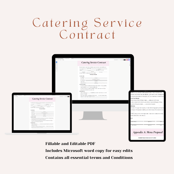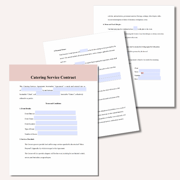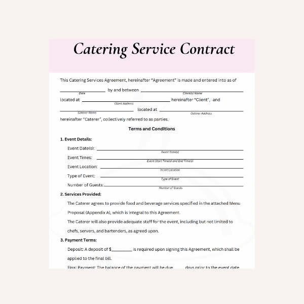 Ensure a seamless catering experience with our professionally crafted Catering Contract Template. Designed for event planners and catering services, this template covers all essential aspects including payment terms, services provided, cancellation policies, and liability clauses.