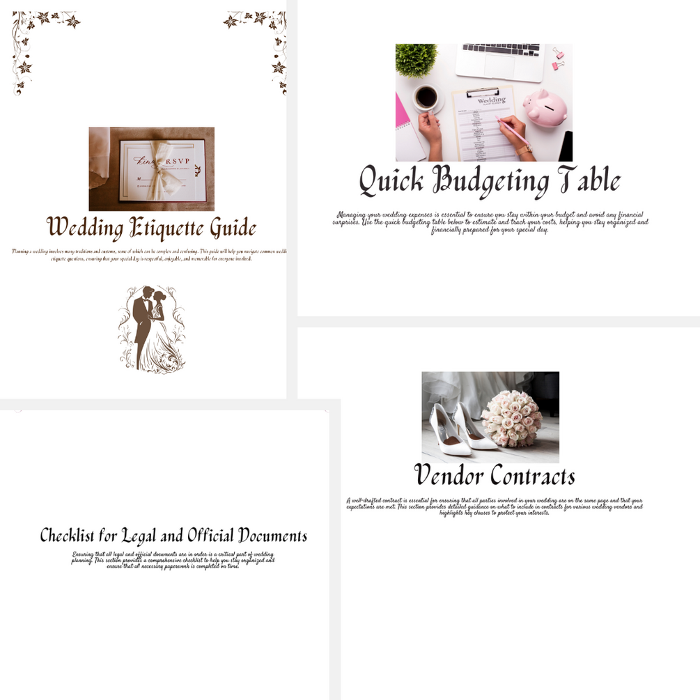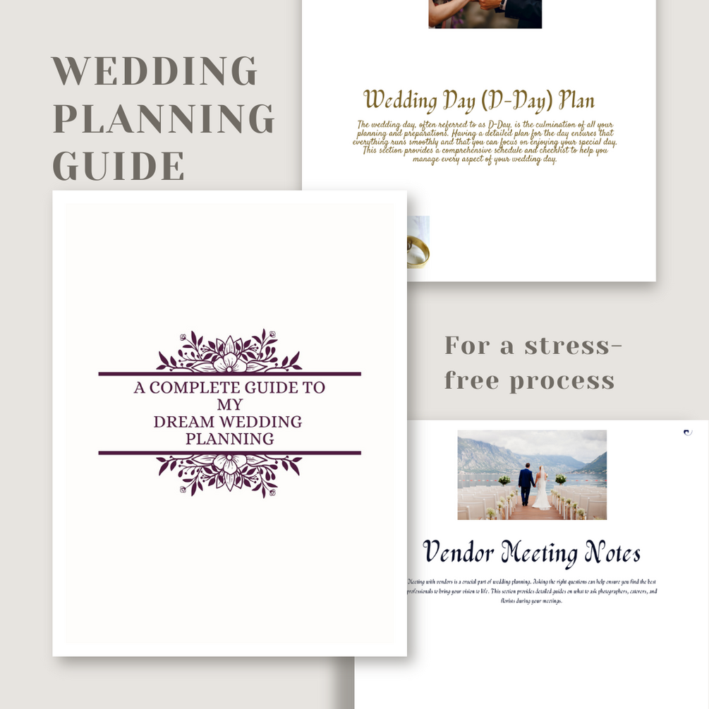 Planning your perfect wedding just got easier with "The Complete Wedding Planning Guide"! This comprehensive guide is designed to take the stress out of wedding planning, providing you with everything you need to organize a flawless celebration. Inside, you'll find detailed checklists, customizable contracts, budgeting tools, and expert tips to ensure your big day goes off without a hitch.